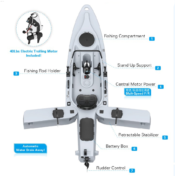 Каяки торговой марки Haswing являются высокотехнологичными и современными устройствами. Каяк Haswing 54603 оснащен троллинговым мотором Haswing 40 LBS для обеспечения комфортного и быстрого продвижения по воде. Каяк оснащен вспомогательной стойкой для рыбалки в положении стоя и более комфортного осмотра местности. Ножное управление курсом осуществляется с помощью педалей, что позволяет иметь свободные руки. Рулевое управление соединяется с устройством поворота с помощью металлического троса и имеет очень чувствительное реагирование на изменение курса. Наклон мотора осуществляется с помощью отдельной кабельной системы, проложенной по днищу. В задней части сиденья расположен аккумуляторный отсек, соединены проводами с мотором. Управление скоростью 5 вперед- 3 назад происходит с помощью секторного переключателя. Рекомендованный заводом аккумулятор должен иметь емкость от 105 Ач. Встроенный светодиодный индикатор позволяет контролировать заряд батареи, что обеспечивает безопасное возвращение на берег.