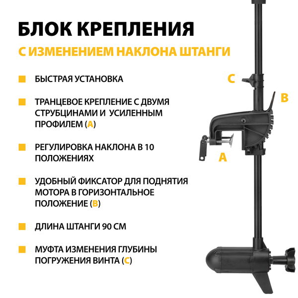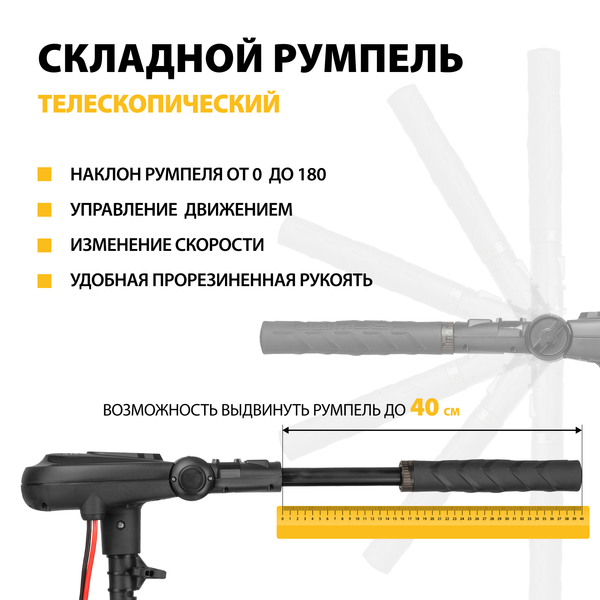 Румпель телескопический, с возможностью регулировки наклона вверх и вниз. Механизм крепления мотора к транцу судна выполнен из прочного полимерного пластика. Кожух двигателя имеет алюминиевые ребра для увеличения прочности и повышения теплоотдачи.